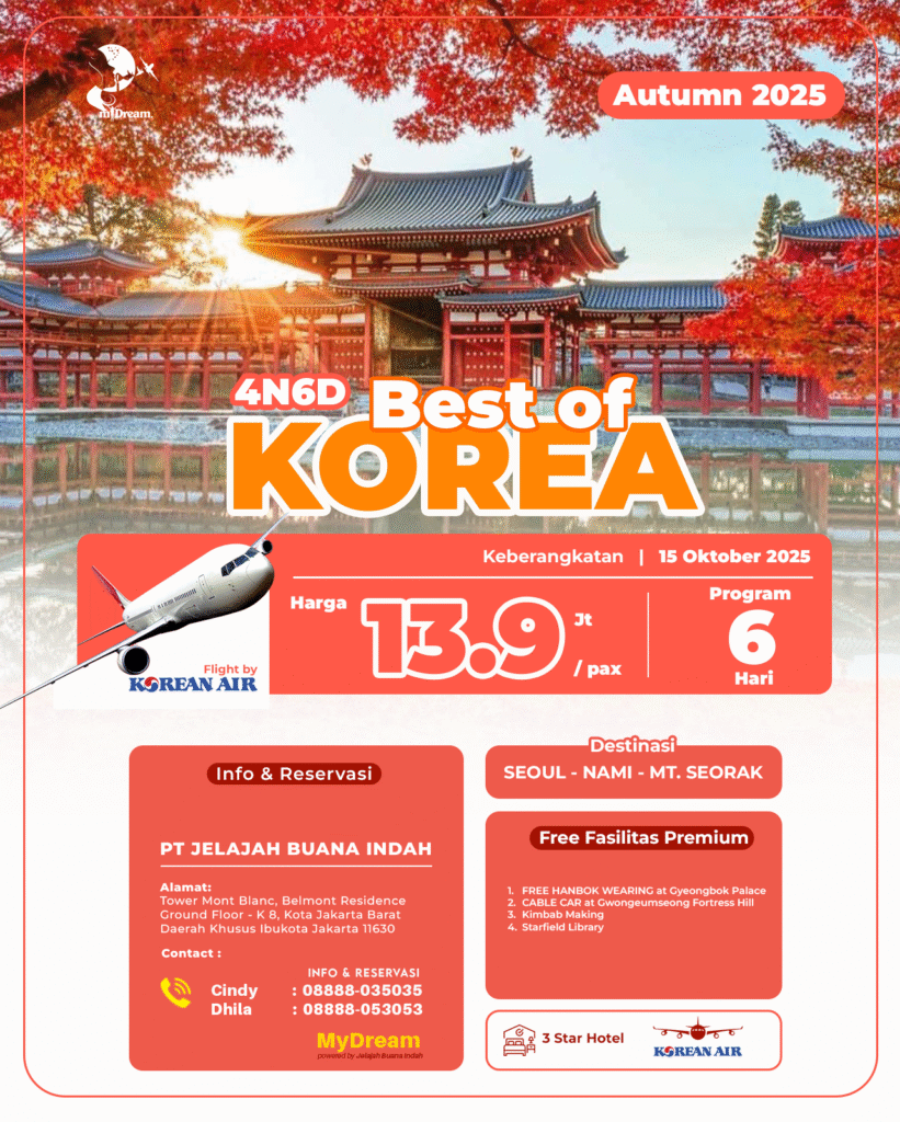Nikmati musim gugur di Korea Selatan dengan paket 6 Hari 4 Malam hemat yang tetap seru dan berkesan! Cocok buat kamu yang ingin jalan-jalan ke Korea tanpa harus keluar budget besar. Mulai dari keindahan alam di Nami Island dan Mt. Seorak, hingga serunya city tour di Seoulβsemuanya dirancang padat, efisien, dan ramah di kantong. Dapatkan pengalaman budaya, kuliner, dan pemandangan khas autumn Korea dalam satu perjalanan hemat tapi lengkap!