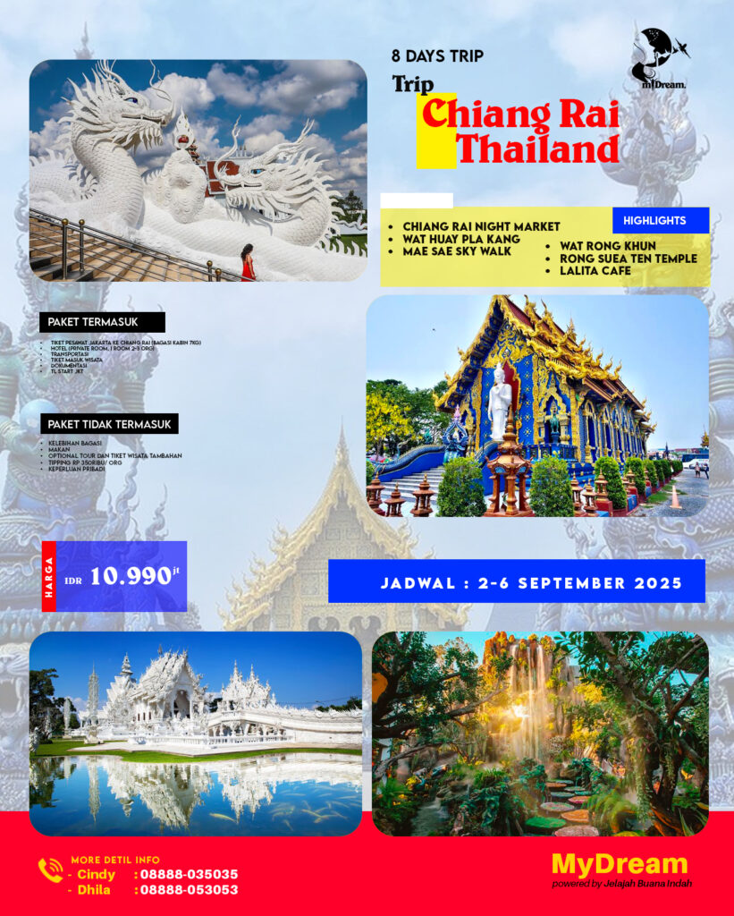 Perjalanan ini akan membawa Anda menikmati suasana lokal di Chiang Rai Night Market, berfoto di spot cantik Lalita Cafe, serta mengagumi arsitektur megah dan spiritual di kuil-kuil ikonik seperti: