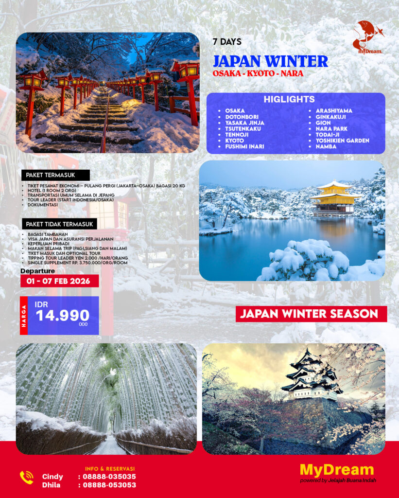 Mulai dari Osaka yang semarak dengan kuliner khas dan gemerlap kota, lanjut ke Kyoto yang memukau dengan kuil-kuil bersejarah dan taman bersalju yang tenang, hingga Nara yang damai, tempat Anda bisa berinteraksi dengan rusa-rusa jinak di tengah lanskap musim dingin yang memukau.