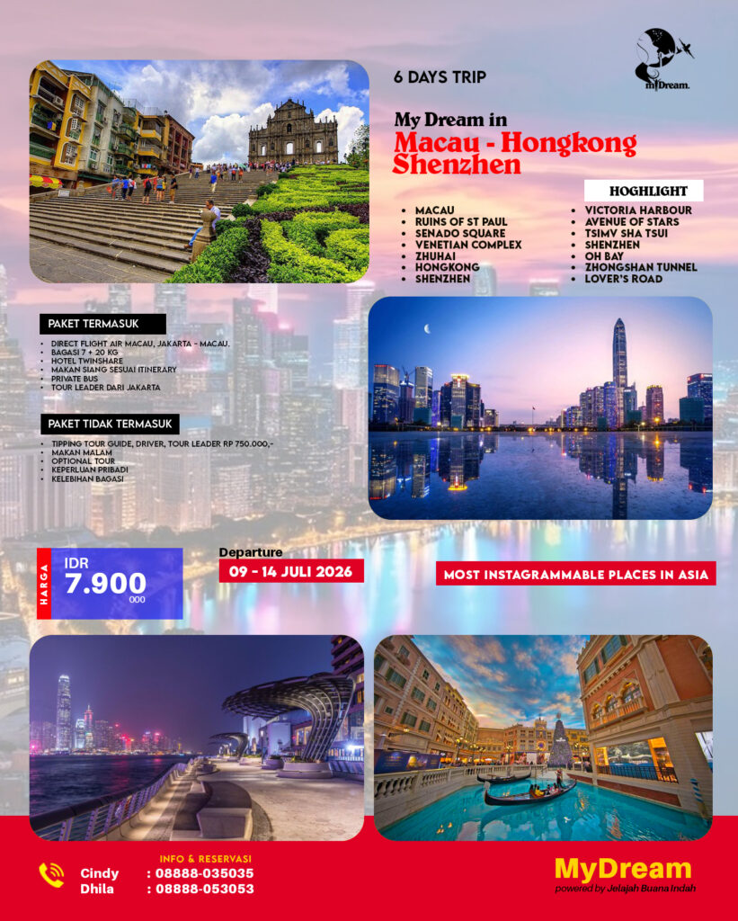 Mulai dari Macau dengan pesona arsitektur kolonial, landmark bersejarah, hingga casino megah; lanjut ke Hongkong untuk menikmati panorama malam dari Victoria Peak, belanja di kawasan pusat kota, dan merasakan atmosfer kota modern yang dinamis; lalu tutup dengan petualangan di Shenzhen, surga belanja dan kota teknologi yang penuh spot Instagramable serta kuliner khas Tiongkok.