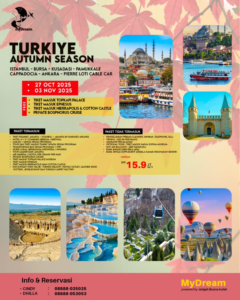 Nikmati keindahan musim gugur di Turki dengan mengunjungi kota-kota ikonik seperti Istanbul, Bursa, Kusadasi, Pamukkale, Cappadocia, dan Ankara.