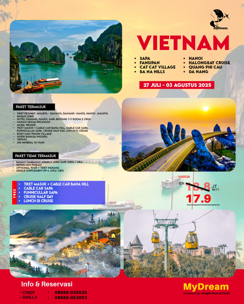 Mulai dari Hanoi yang klasik dan bersejarah, menuju Sapa yang sejuk dan memukau, hingga menaklukkan Fansipan, puncak tertinggi di Indochina dengan kereta gantung yang spektakuler.